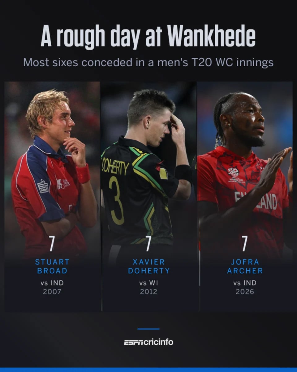 انگلینڈ کے جوفرا آرچر کو سات چھکے لگے جو ٹی ٹوئنٹی ورلڈکپ میں کسی بولر کو لگنے والے سب سے زیادہ چھکوں کے برابر ہیں۔