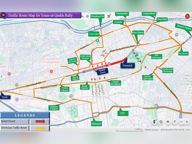 اسی طرح، ناظم آباد سے ٹاور جانے والی ٹریفک کو لسبیلہ سے نشتر روڈ، رنچھوڑ لائن اور سول اسپتال کے راستے جانے کی ہدایت کی گئی ہے۔ فریسکو چوک اور عیدگاہ چوک سے نمائش کی جانب آنے والی ٹریفک کو تبت چوک سے ریگل چوک، ایمپریس مارکیٹ یا جوبلی کے راستے آغا خان انکل سیریا اور کوسٹ گارڈ سے سولجر بازار کی جانب موڑا جائے گا۔