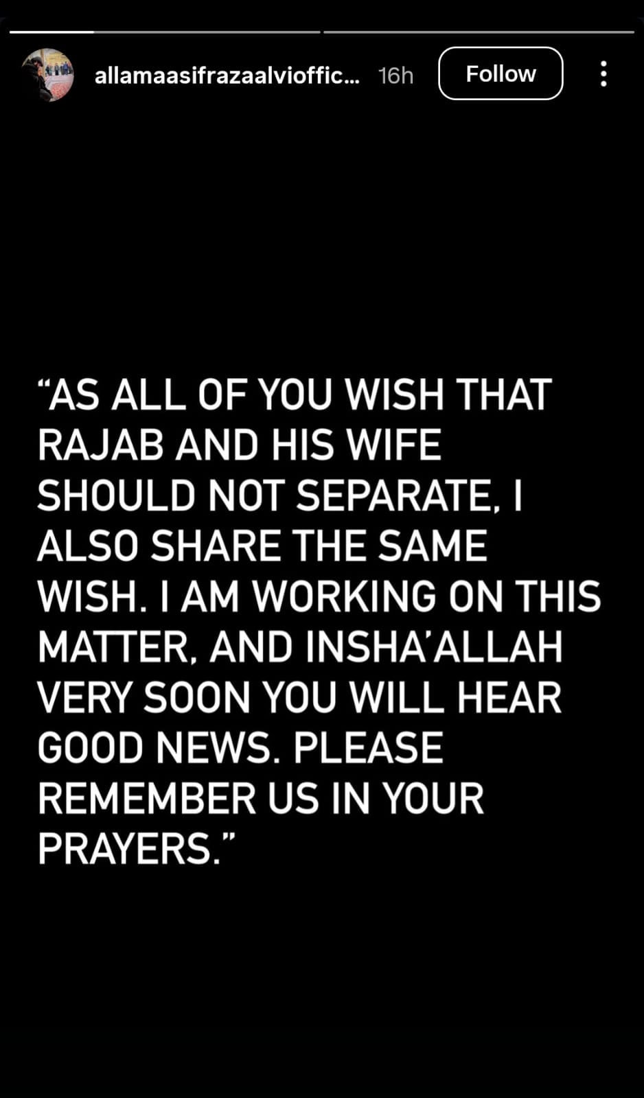 علامہ آصف رضا علوی نے اپنے سوشل میڈیا پیغامات میں کہا ہے کہ وہ نہیں چاہتے کہ رجب بٹ اور ایمان فاطمہ کی شادی ٹوٹے۔ ان کا کہنا ہے کہ وہ دونوں کے درمیان صلح کرانے کے لیے اپنا کردار ادا کریں گے اور جلد اس حوالے سے اچھی خبر سامنے آ سکتی ہے۔