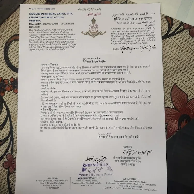 بعد ازاں، گانے پر بھارتی ریاست اترپردیش کے دارالافتاء کی جانب سے فتویٰ بھی جاری کردیا گیا ہے، یہ فتویٰ مسلم پرسنل دارالافتاء سے وابستہ ایک سینئر عالمِ دین کی جانب سے جاری کیا گیا۔