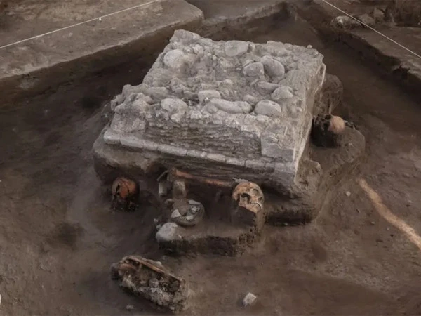 قربان گاہ کی بنیاد کے گرد چار کھوپڑیاں احتیاط سے ترتیب دی گئی ہیں۔