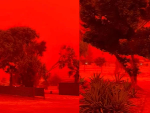 رپورٹس کے مطابق یہ غیر معمولی منظر اس وقت دیکھنے میں آیا جب سائیکلون ناریلے کے زیرِ اثر تیز ہوائیں چلیں، جنہوں نے زمین سے آئرن آکسائیڈ سے بھرپور گرد کو فضا میں بلند کر دیا۔ چند ہی منٹوں میں دن کی روشنی مدھم ہو گئی اور آسمان سرخ اور نارنجی رنگ اختیار کر گیا۔