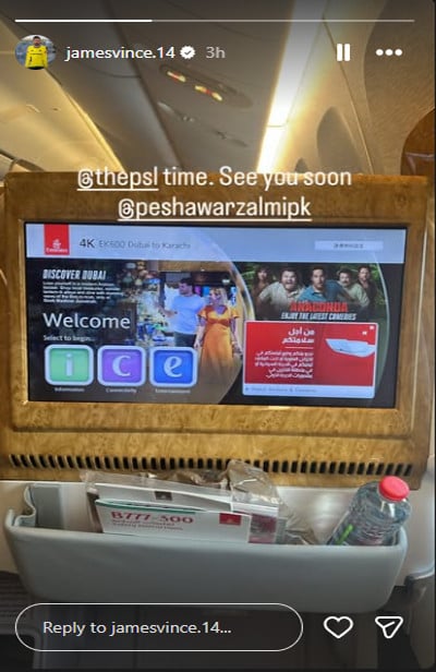 جیمز ونس نے اپنی انسٹاگرام اسٹوری پر جہاز کے اندر کی ایک تصویر شیئر کی ہے جس کے کیپشن میں انہوں نے لکھا کہ پی ایس ایل کا وقت ہوگیا ہے۔