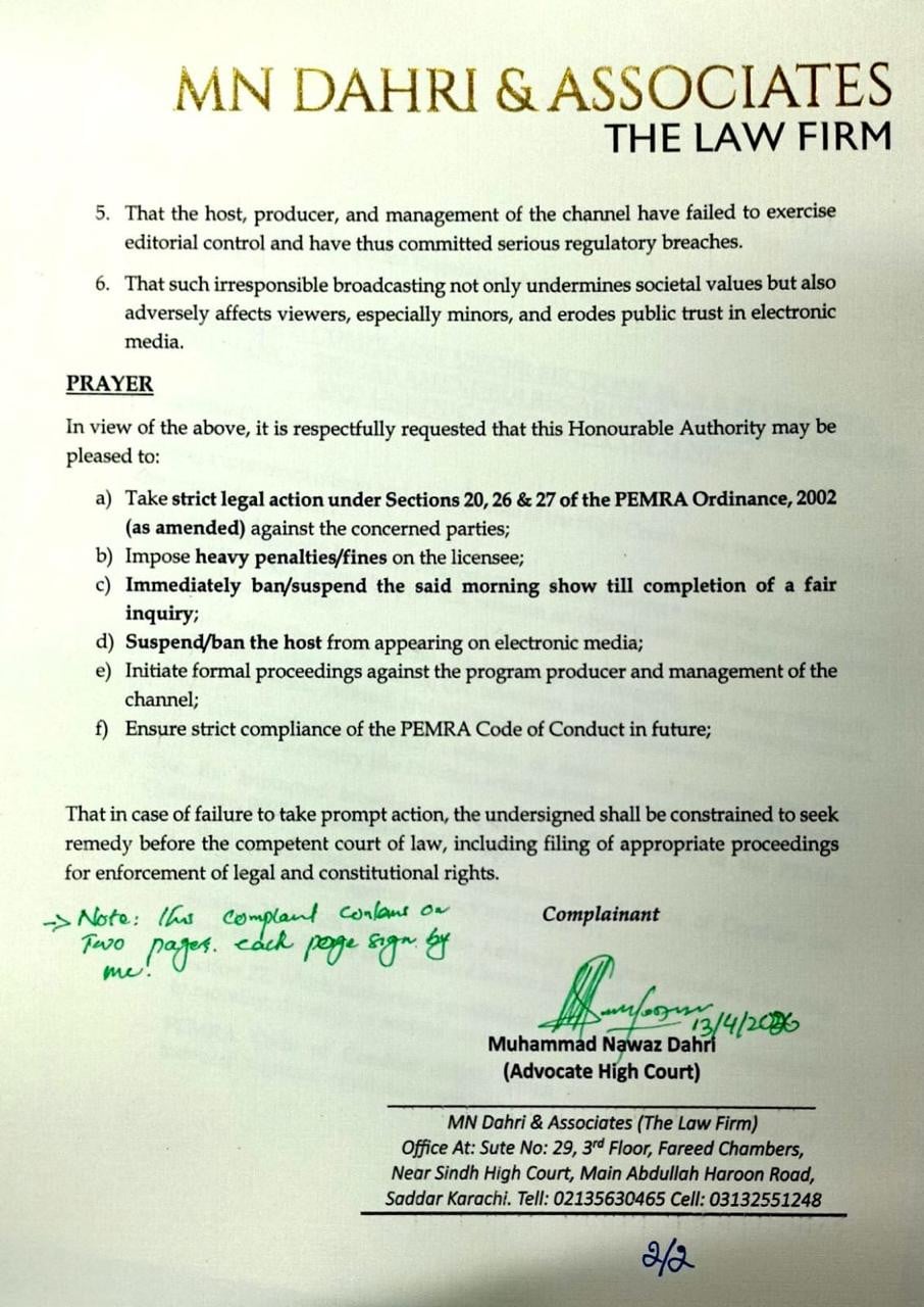 ایکسپریس نیوز کے مطابق محمد نواز ڈاہری ایڈووکیٹ نے نجی ٹی وی کے مارننگ شو میں میزبان اور مہمان کی جانب سے نازیبا حرکات پر چیئرمین پیمرا کو شکایت جمع کردی۔