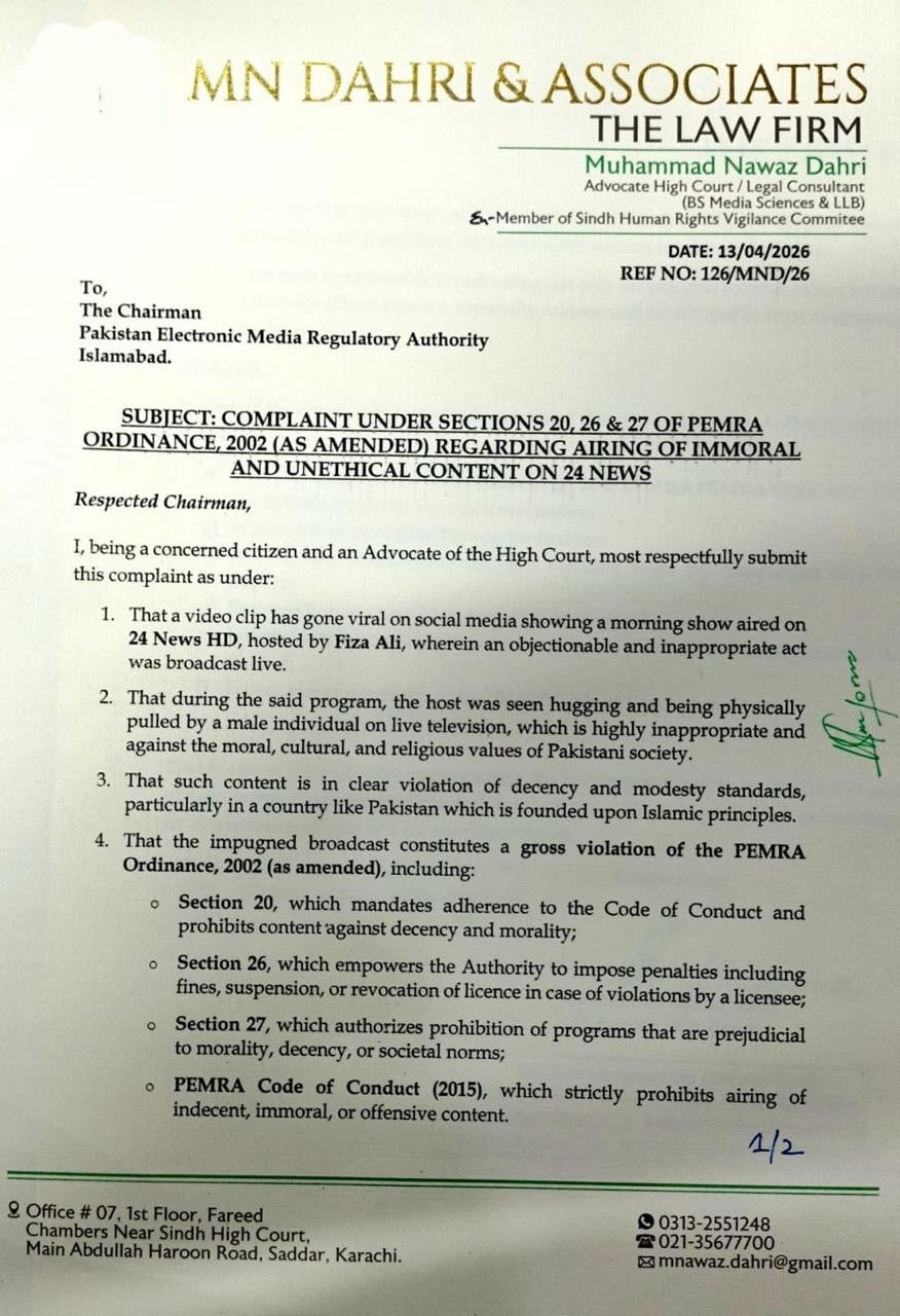 درخواست میں ٹی وی میزبان فضا علی کی جانب سے مبینہ طور پر اپنے شوہر کے ساتھ براہ راست پروگرام میں نازیبا اور غیر اخلاقی عمل پر کارروائی کی سفارش کی گئی ہے۔