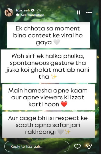 پاکستانی اداکارہ اور میزبان فضا علی حالیہ وائرل آن ایئر لمحے پر ہونے والی تنقید کے بعد سامنے آ گئیں اور اپنے مؤقف کی وضاحت کی ہے۔