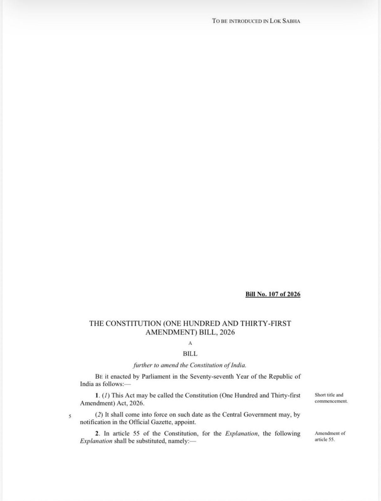 بی جے پی حکومت پارلیمنٹ کے آئندہ اجلاس میں 131واں آئینی ترمیمی بل 2026 (بل نمبر 107 آف 2026) پیش کر رہی ہے. لوک اور راجیہ سبھا کا مشترکہ اجلاس 16-18 اپریل کو بلایا گیا ہے۔