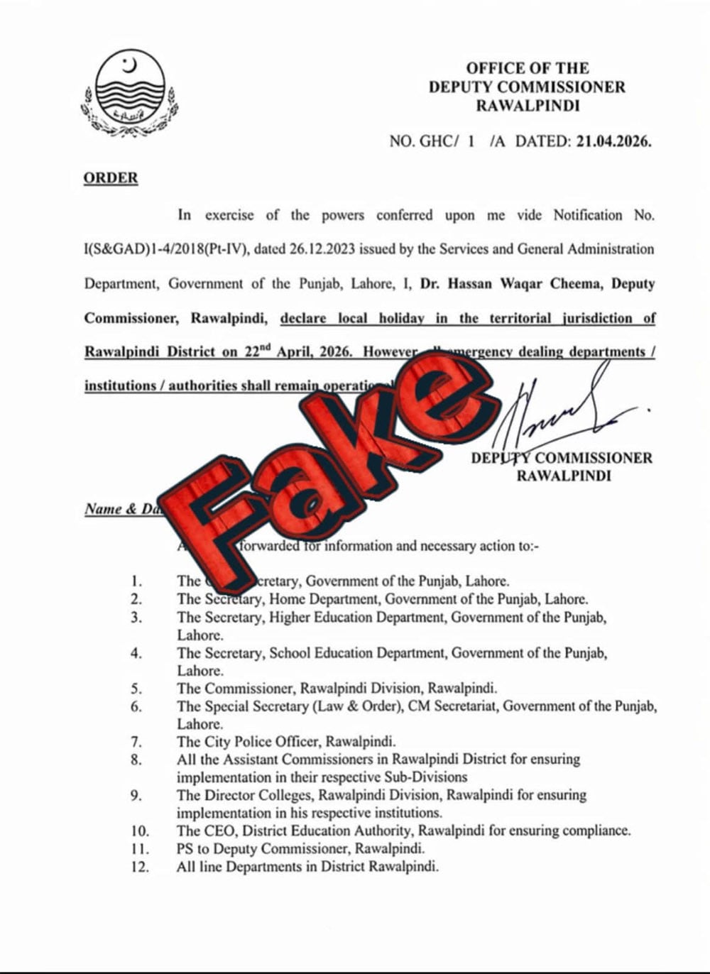 راولپنڈی کی حدود میں مقامی تعطیل کا سوشل میڈیا پر جعلی نوٹی فکیشن وائرل ہوگیا۔