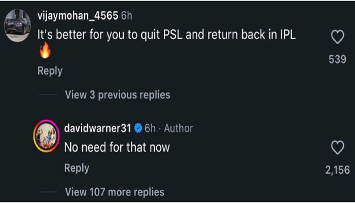 بھارتی صارف نے کہا کہ آپ کے لیے بہتر ہے کہ پی ایس ایل چھوڑ دیں اور آئی پی ایل میں واپس آ جائیں، جس پر ڈیوڈ وارنر نے کہا کہ اب اس کی کوئی ضرورت نہیں ہے۔