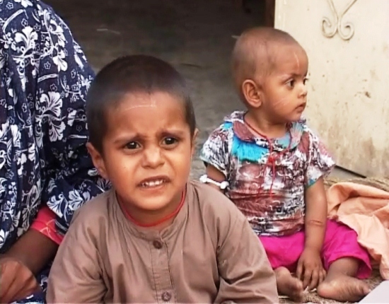 علی عباس کے تینوں بچوں کے جسم گہرے زخموں سے بھرے پڑے ہیں ، سب سے زیادہ کٹ علی حسنین کے جسم پر ہیں۔ 6 سال کا یہ بچہ خون کی مسلسل کمی سے ہڈیوں کا ڈھانچہ بن چکا ہے ،چلنا پھرنا تو دورکی بات یہ ننھا فرشتہ بغیرسہارے کے بیٹھ بھی نہیں سکتا تاہم اس کے چھوٹے بھائی چارسالہ زین اور دو سال کی ایمان زہرا کی حالت قدرے بہترہے۔
