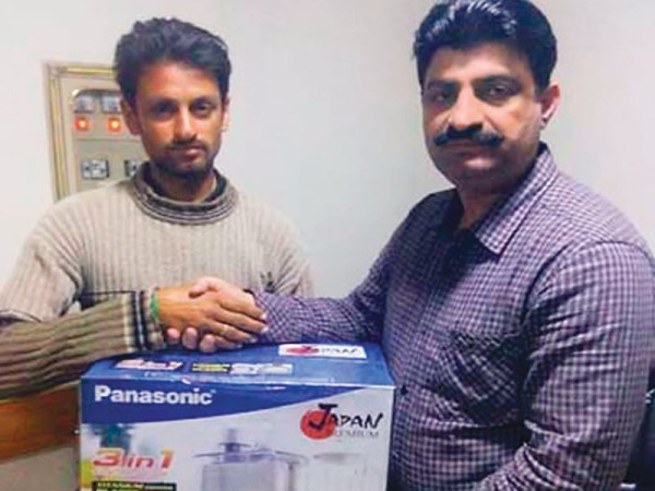 پاکستان اور ویسٹ انڈیز میچ کا ایک درست جواب دینے پرقصور کے رفاقت کونمائندہ ایکسپریس مہرجاوید انعام دے رہے ہیں ۔ فوٹو : ایکسپریس