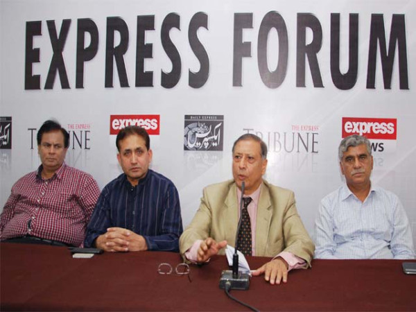 چینی صدر کا دورہ پاکستان کے حوالے سے ایکسپریس فورم سے سابق سفارت کار جاوید حسین خطاب کررہے ہیں جبکہ بریگیڈر (ر) سید غضنفر علی، ڈاکٹر اعجاز بٹ اور ڈاکٹر حیفظ الرحمن ساتھ بیٹھے ہیں ۔ فوٹو : ایکسپریس