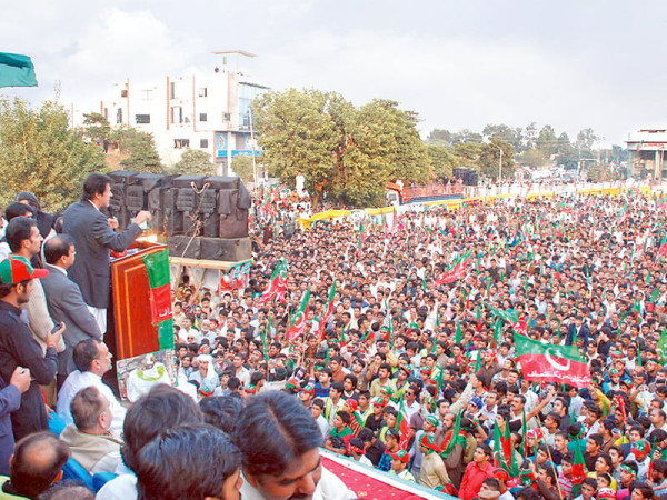 میرپور: تحریک انصاف کے چیئرمین عمران خان جلسہ عام سے خطاب کررہے ہیں۔ فوٹو: این این آئی