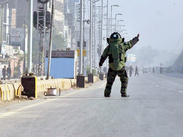 پشاور :بم ڈسپوزل اسکواڈ کااہلکار برآمد بم کو ناکارہ بنانے سے پہلے لوگوں کو دوسری جانب جانے کا اشارہ کررہا ہے۔ فوٹو: آن لائن