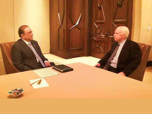 سابق صدرآصف علی زرداری سے لاس اینجلس میں سینیٹرجان میکین نے ملاقات کی اور ملاقات میں امریکا اورپاکستان کے درمیان باہمی دلچسپی کے امورپر تبادلہ خیال کیاگیا۔