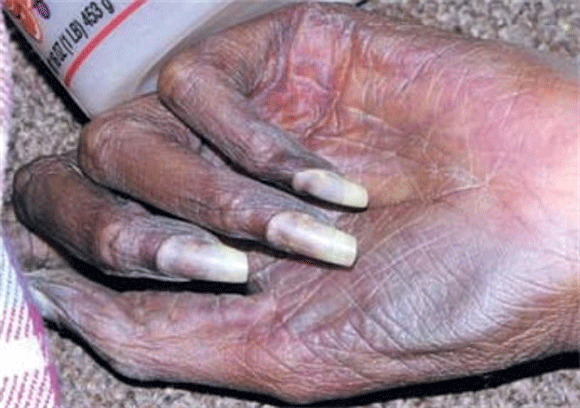 رگوں میں خون کا بہاؤ رُک جانے کی وجہ سے کششِ ثقل اس خون کو نیچے کی طرف کھینچ لیتی ہے۔ نتیجتاً سرخ و سفید رنگت والی جلد پیلی پڑجاتی ہے اور اس پر جگہ جگہ سرخ دھبے نمایاں دکھائی دینے لگتے ہیں۔