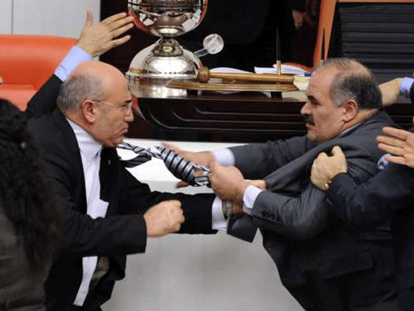 ترکی کے دارالحکومت انقرہ میں اسمبلی کی کارروائی کے دوران کسی بحث کے نتیجے میں حکومتی رکن اسمبلی مہوتن اکساک اور اپوزیشن پارٹی کے رکن مہمت تنال نے ایک دوسرے کا گریبان پکڑ رکھے ہیں۔