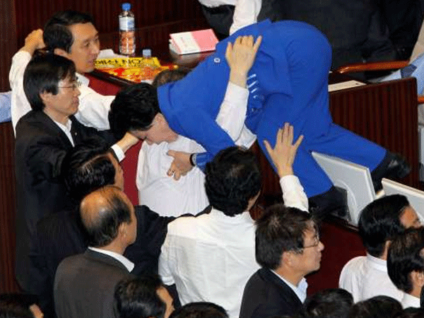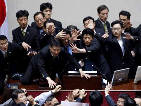 جنوبی کوریا کے دارالحکومت سویل میں نیشنل اسمبلی کی کارروائی کے دوران حکومت اور اپوزشین ارکان کے درمیان لڑائی کے نتیجے میں حزب اختلاف کے ارکان اپنے ایک ساتھی رکن کو فرار کروانے کی کوشش کررہے ہیں۔
