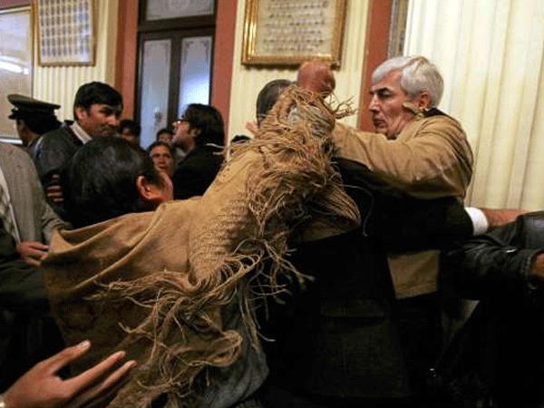 بولیویا کے دارالحکومت لاپاز میں کانگریس سیشن کے دوران اپوزیشن رکن صدر کے ڈپٹی کے ساتھ لڑائی میں مصروف ہے۔