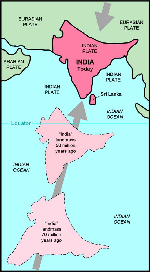تقریباً 9 کروڑ سال پہلے یہ انڈین ٹیکٹونک پلیٹ، مڈغاسکر سے بھی الگ ہوگئی اور تقریباً 150 ملی میٹر سالانہ کی رفتار سے شمال کی سمت بڑھنے لگی۔ آج سے لگ بھگ 5 کروڑ سال پہلے انڈین پلیٹ نے یورپ اور ایشیا پر مشتمل ٹیکٹونک پلیٹ (یوریشین پلیٹ) سے ٹکرانا شروع کیا جس کی وجہ سے اس کی رفتار کم ہوتے ہوتے موجودہ 65 ملی میٹر سالانہ جتنی رہ گئی لیکن ساتھ ہی ساتھ اس عظیم تصادم کے نتیجے میں ہمالیہ کا پہاڑی سلسلہ بھی وجود میں آیا جہاں آج دنیا کے بلند ترین پہاڑ موجود ہیں۔