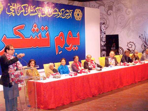آرٹس کونسل آف پاکستان کے نو منتخب صدر احمد شاہ یوم تشکر کی تقریب سے خطاب کر رہے ہیں،کامیاب عہدیداران اسٹیج پر بیٹھے ہیں۔ فوٹو: ایکسپریس