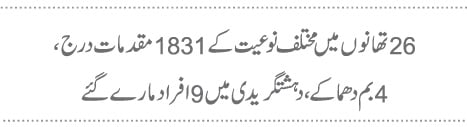 ایک سو خواتین کے ساتھ زیادتی کیے جانے کے واقعات کے مقدمات درج کیے گئے ہیں، موٹر سائیکل چوری اور چھینے جانے کے 88مقدمات درج کیے گئے ہیں، جبکہ قومی شاہراہ پر مختلف مقامات پر مسافر بسوں سے کروڑوں روپے لوٹ جانے کے واقعات بھی درج کیے گئے۔