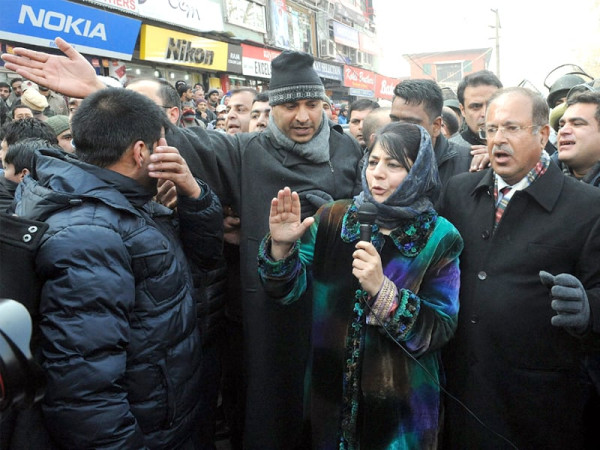 سرینگر: مقبوضہ کشمیر کی سب سے بڑی مخالف جماعت پیپلز ڈیموکریٹک پارٹی کی صدر محبوبہ مفتی احتجاجی مظاہرے سے خطاب کررہی ہیں۔ فوٹو: اے ایف پی