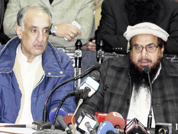 لاہور: دفاع پاکستان کونسل کے رہنما حافظ محمد سعید صحافیوں سے گفتگو کررہے ہیں۔ فوٹو: این این آئی