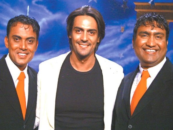 پاکستانی کامیڈین عرفان ملک اور علی حسن کا بھارتی اداکار ارجن رام پال کے ساتھ گروپ فوٹو۔ فوٹو: فائل