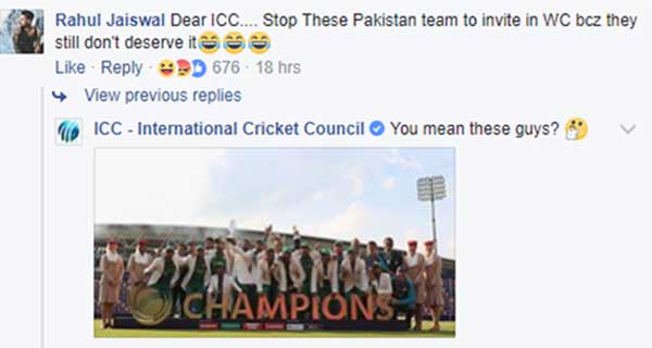 ورلڈ باڈی کے فیس بک پر ایک بھارتی شائق نے لکھا کہ 'پاکستانی ٹیم کو عالمی کپ میں دعوت دینا ختم کردیں کیوں کہ یہ اس کی مستحق نہیں'اس کے جواب میں آئی سی سی نے پاکستان کرکٹ ٹیم کی چیمپئنز ٹرافی جیتنے والی تصویر پوسٹ کردی۔