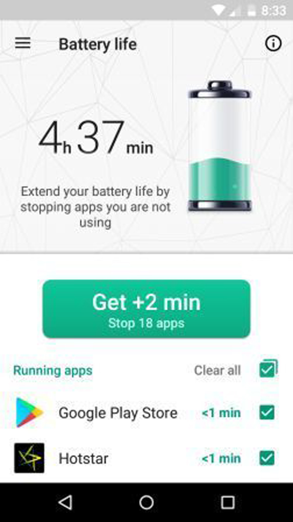 فوری طور پر لانچ ہونے والی اس ایپ کے ذریعے آپ معلوم کرسکتے ہیں کہ بیٹری کتنی دیر میں مکمل چارج ہوگی۔ یہ بیٹری کا درست اسٹیٹس بھی بتاتی رہتی ہے کہ بیٹری کتنے گھنٹے یا منٹوں کے بعد خاموش ہوجائے گی۔ اسی طرح ایپ بتاتی ہے کہ کن کن ایپلی کیشنز کو بند کرکے آپ بیٹری کی توانائی خرچ ہونے سے بچاسکتےہیں۔