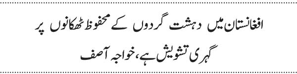خواجہ آصف نے کہا کہ دہشت گردی کے خلاف جنگ میں پاکستان کی نمایاں کامیابیوں سے ملک میں دہشت گردی کے واقعات میں نمایاں کمی آئی ہے اور جب تک افغانستان میں امن و استحکام قائم نہیں کیا جاتا خطے میں پائیدار امن و استحکام ممکن نہیں اور پاکستان خطے میں قیام امن کیلئے مثبت کردار ادا کرتا رہے گا، اس مقصد کے حصول کیلئے امریکا اور پاکستان کو قریبی کام کرنے کی ضرورت ہے۔ انہوں نے کہا کہ ہم نے اپنے حصہ کا کام کرکے دہشت گردوں اور ریاست مخالف عناصر کے ٹھکانے ختم کر دیئے ہیں۔