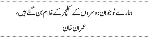 میانوالی میں نجی یونیورسٹی کے طلبا سے خطاب کرتے ہوئے عمران خان کا کہنا تھا کہ پاکستان میں 70 فیصد آبادی 35 سال سے کم عمر نوجوانوں پر مشتمل ہے اور ہمارے نوجوان دوسروں کے کلچر کے غلام بن گئے ہیں، دنیا سے پیچھے رہ جانے کی وجہ سے ہماری قوم الجھن کا شکار ہے ہم مغربی ثقافت سے متاثر نظر آتے ہیں لیکن دنیا میں کسی بھی جگہ جائیں اپنے ملک اور شناخت کو نہ بھولیں کیوں کہ گدھے کے اوپر لکیریں ڈالنے سے وہ زیبرا نہیں بن جاتا۔