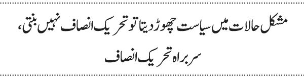 عمران خان کا کہنا تھا کہ جو ہار نہیں مانتے ان کو ہار ہرا نہیں سکتی جب کوئی نیا کام کرنا شروع کرتا ہے تو لوگ اسے پاگل کہتے ہیں میرا بھی مذاق اڑایا گیا لیکن میں جس مقصد کے پیچھے جاتا ہوں تو اپنی کشتیاں جلا کر جاتا ہوں اگر میں مشکل حالات میں سیاست چھوڑ دیتا تو تحریک انصاف نہ بنتی اور تحریک انصاف نہ بنتی تو عوام ان ہی پرانے سیاستدانوں کے غلام بن کررہتے۔